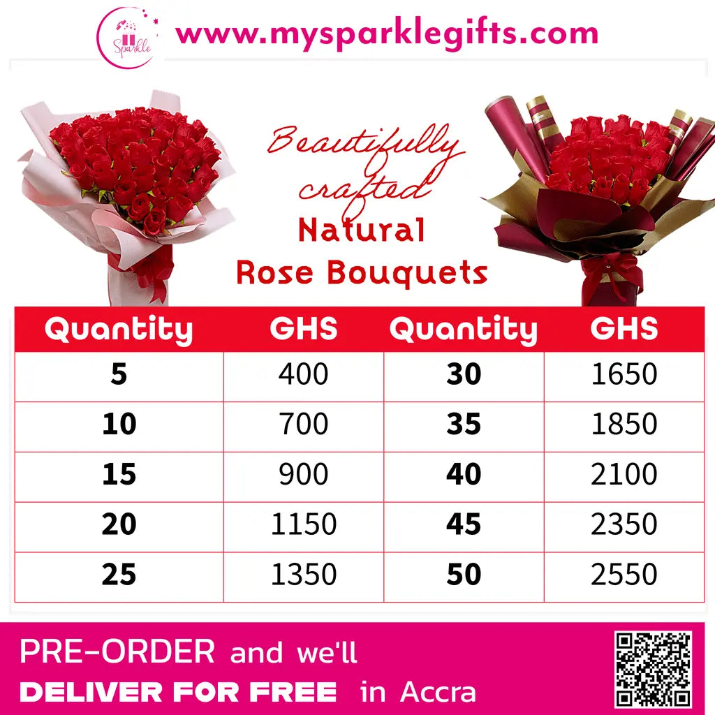 A serene and stunning arrangement of 25 fresh natural roses. This bouquet makes the perfect gift for any occasion where beauty and elegance are appreciated, from birthdays to romantic gestures. Carefully arranged and wrapped with care for that perfect gift-giving experience