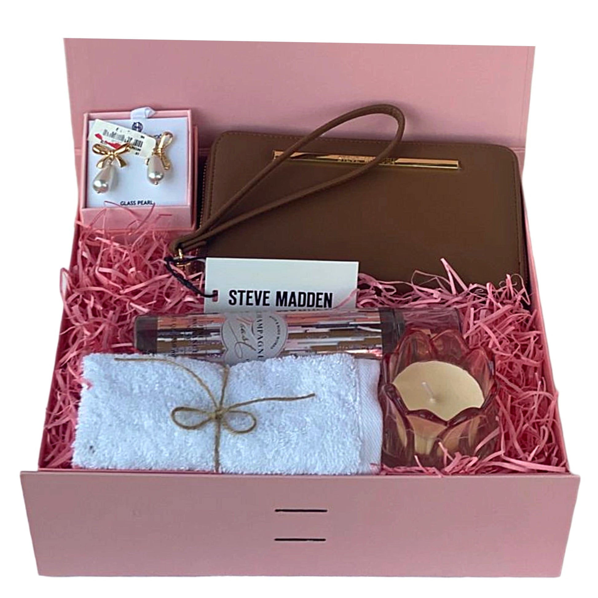 Treat her to sophistication with our Steve Madden Luxury Gift Set, featuring a designer handbag, Bath & Body Works mist, sparkling earrings, a soft face towel, and a scented candle. Perfect for birthdays, anniversaries, or special occasions, this elegant set blends style, fragrance, and comfort in one luxurious package.