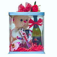 A heartwarming gift set featuring an adorable teddy bear, a fine bottle of non-alcoholic wine, an elegant mug, and a beautifully crafted artificial roses. Paired with gourmet chocolate and premium packaging for a memorable surprise.