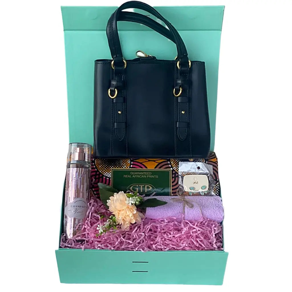 Indulge her in elegance with this thoughtfully curated gift box, featuring a stylish black handbag, 6 yards of vibrant GTP fabric, refreshing Bath & Body Works mist, soft face towel, and classy earring. Perfect for birthdays, appreciation gifts, or simply to celebrate the amazing woman she is.