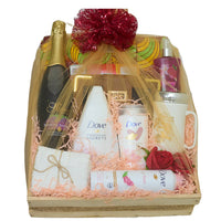 Pamper the important woman in your life with this all-in-one gift set: fashionable GTP cloth, fine non-alcoholic wine, a classic mug, refreshing body splash, Dove gel, deodorant, lotion, a cozy face towel, and a stylish purse, wrapped with elegance.