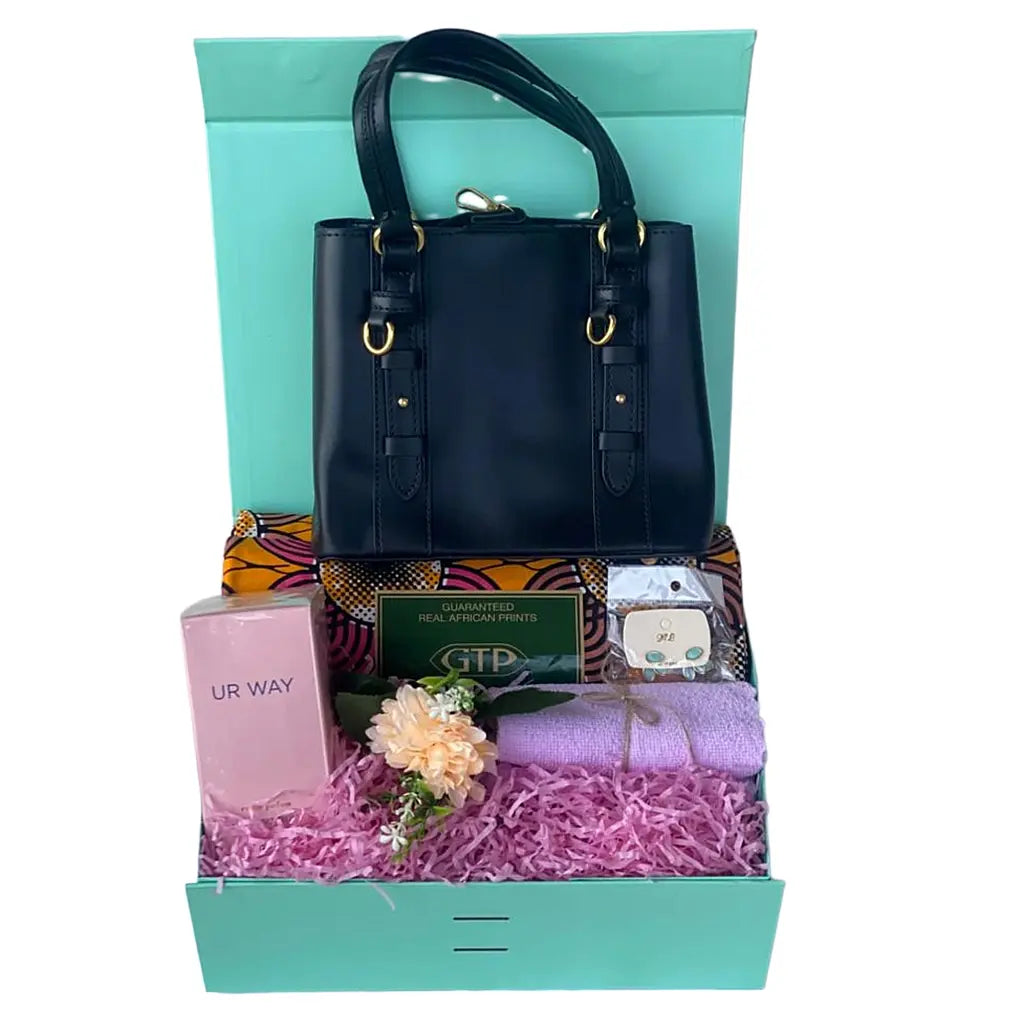 This elegant gift box includes a trendy handbag, 6 yard beautiful GTP fabric, luxurious perfume, soft face towel, and chic earrings - a perfect blend of style and self-care. Thoughtfully curated for birthdays, appreciation gifts, or simply to remind her she deserves the best.