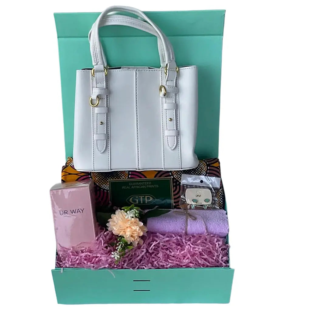 This elegant gift box includes a trendy handbag, 6 yard beautiful GTP fabric, luxurious perfume, soft face towel, and chic earrings - a perfect blend of style and self-care. Thoughtfully curated for birthdays, appreciation gifts, or simply to remind her she deserves the best.
